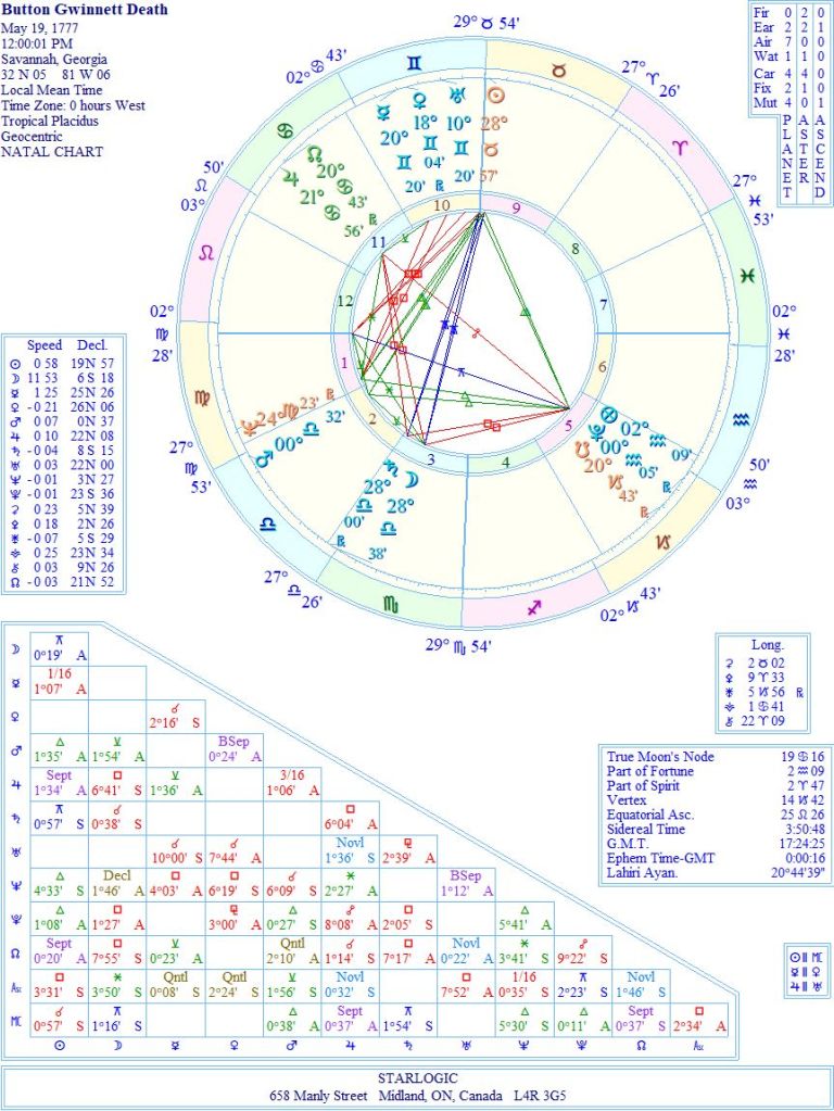 I suppose the strongest ‘proof’ comes in the North and South Nodes flip-flopping between the individuals’ birth charts. And tied in with that inversion is Gwinnett’s ‘fatal’ Moon/Saturn conjunction.