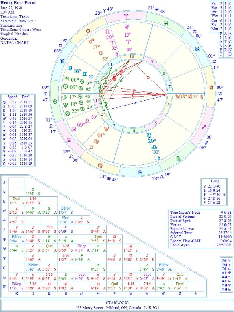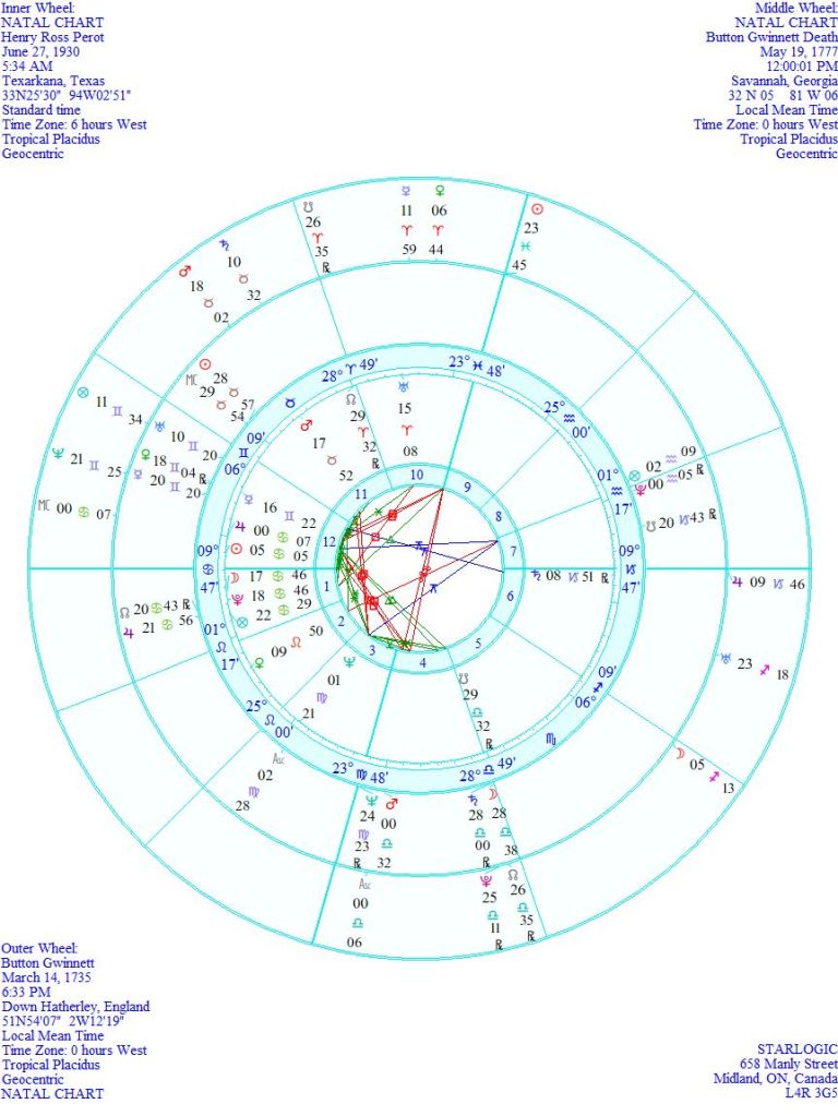 I am not overlooking the fact that Perot’s Saturn (on his Descendant) is conjunct Gwinnett’s natal Jupiter. Gwinnett’s ‘fatal’ Pluto is now the point of a Yod from Perot’s Jupiter and Neptune inconjuncts. Plus, Perot’s Saturn is in an inconjunct of its own with Gwinnett’s ‘fatal’ Uranus and his natal Part of Fortune. And the one that makes these two connected as men of action: the position on Mars in their birth charts is a conjunction @ 18° Taurus.