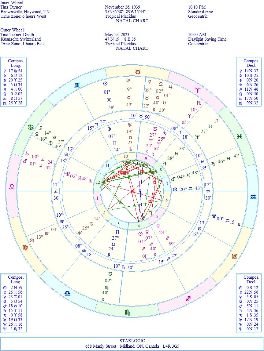 There are several remarkable links between Tina’s birth and death charts: for one thing, her North and South Nodes have flipped; her Neptune moved to the opposite side (conjunct her natal Jupiter); her ‘fatal’ Mars is conjunct her natal Pluto (and opposite her ‘fatal’ Pluto); while her natal Mars is conjunct her ‘fatal’ Saturn; and her natal Uranus returned to its original position. This is proof that she met her personal challenges head-on and conquered them all. This is a successful life well lived.