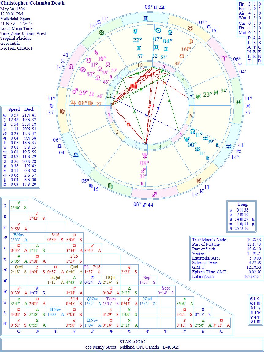 Christopher Columbus‘ birth date is unknown, so I’m starting with his death in 1506. There are a couple of tricky inconjuncts for that day: the Moon and Pluto; and Mars and Neptune. I won’t delineate them.