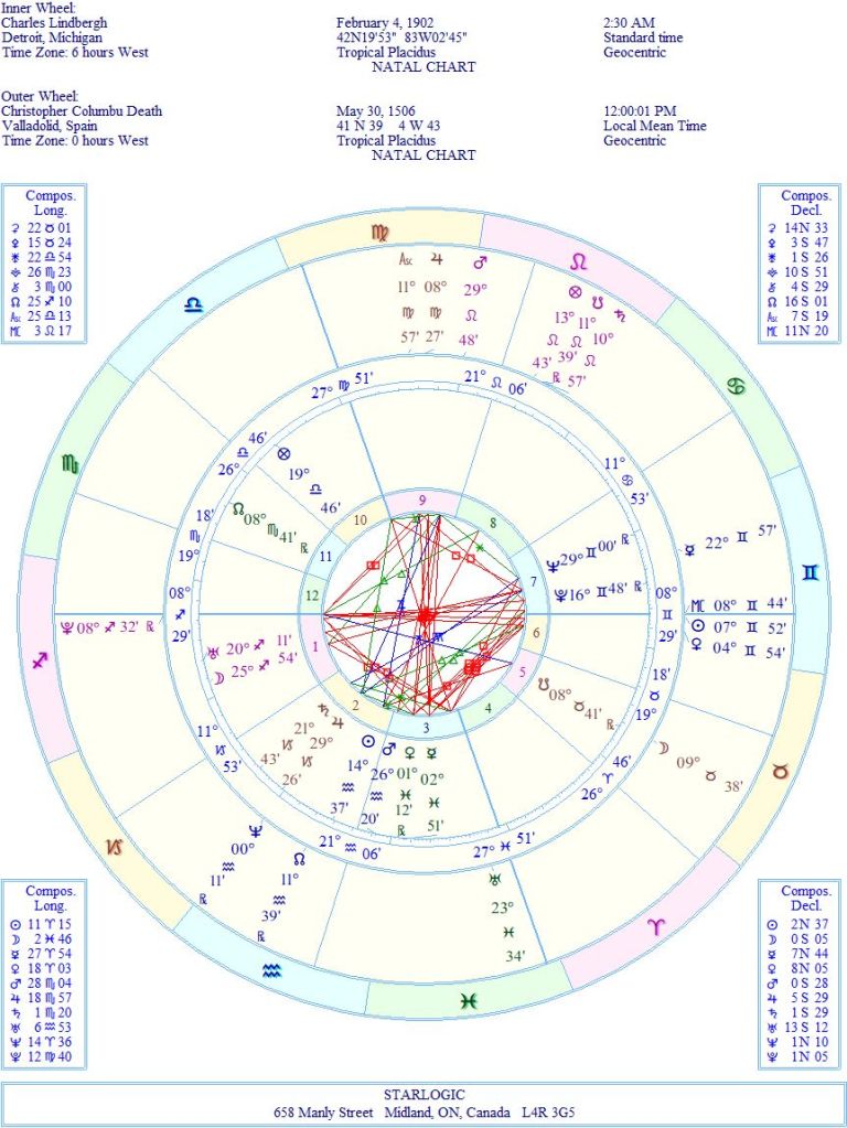 Well, in my humble opinion, the answer is “yes”. Lindbergh’s Sun is conjunct Columbus’ ‘fatal’ North Node. And Lindbergh’s South Node is conjunct Columbus’ ‘fatal’ Moon. (Lindbergh’s Jupiter, the point of an interactive Yod between the two charts, is also conjunct Columbus’ ‘fatal’ Neptune.) And, weirdly, Columbus’ ‘fatal’ Pluto is exactly conjunct Lindbergh’s Ascendant @ 8° Sagittarius, which is Antares, “The Watcher of the West”. I think that explains everything.