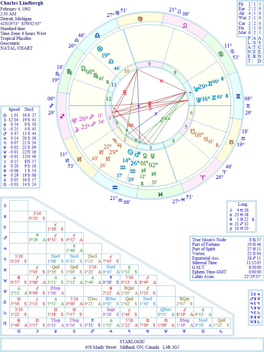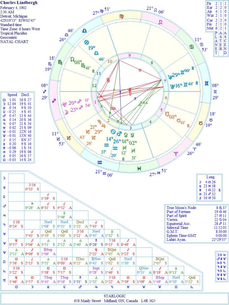 Charles Lindbergh‘s birth chart was already on my computer program, so I won’t alter it. Notice the two inconjuncts. They may be indicative of the ultimate challenges of his whole life.