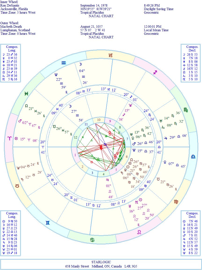 Firstly, notice that the North and South Nodes have flip-flopped, with DeSantis’ Sun conjunct Macbeth’s ‘fatal’ South Node @ 21° Scorpio. DeSantis’ Moon is within 5° of Macbeth’s ‘fatal’ Pluto. And both charts have Uranus situated @ (about) 14° Scorpio. And, finally, DeSantis’ Mars is within 3° of Macbeth’s ‘fatal’ Jupiter, and DeSantis’ Jupiter is opposite Macbeth’s ‘fatal’ Moon. We are on solid ground here reincarnationally.
