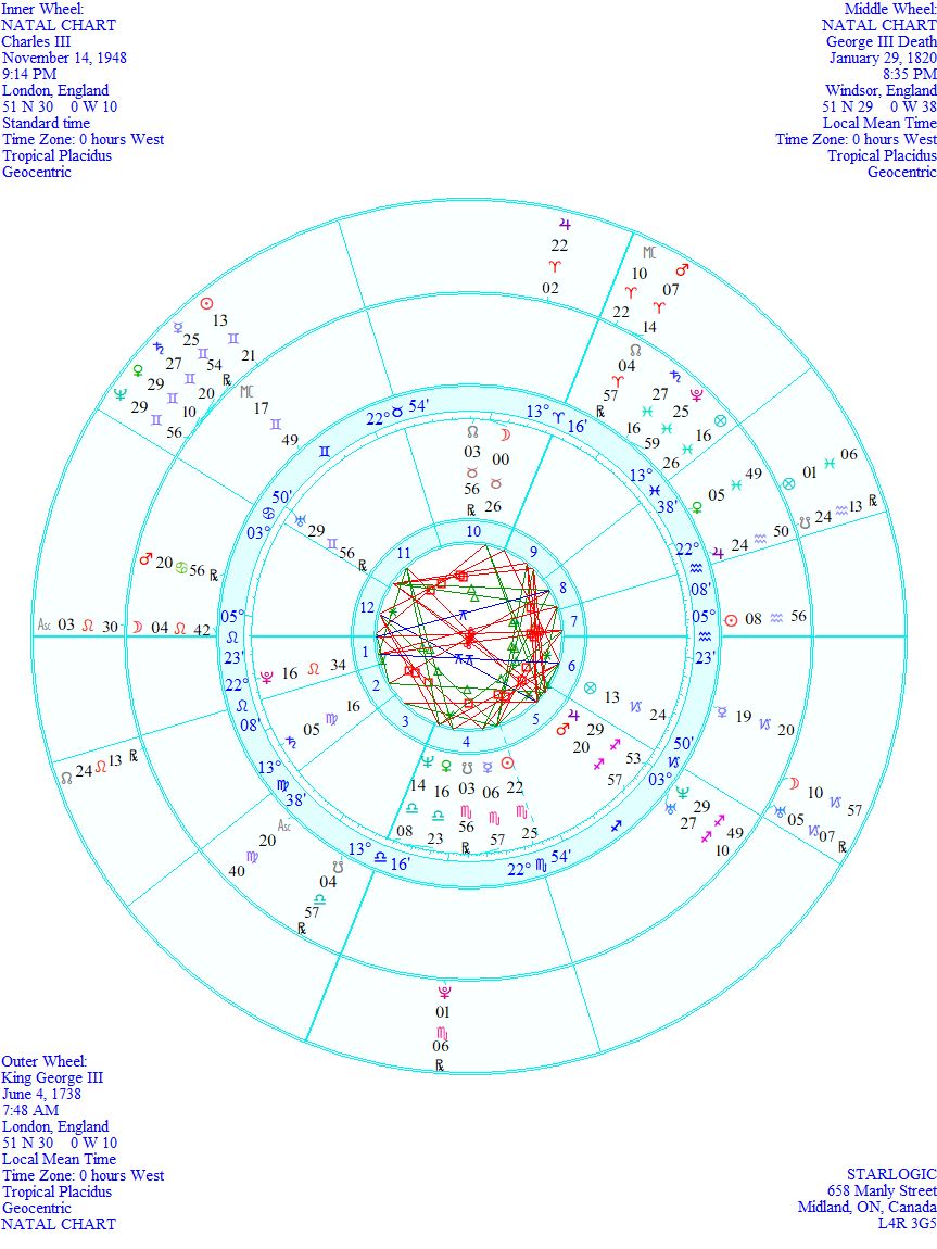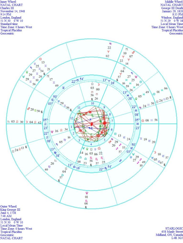 Where do I start? Probably, the best place is the conjunct natal Ascendants. George’s ‘fatal’ Moon is also there. Charles’ Uranus is conjunct George’s natal Venus/Neptune conjunction and opposite George’s ‘fatal’ Uranus/Neptune conjunction (which is conjunct Charles’ Jupiter). Charles’ South Node is conjunct George’s Pluto, and Charles’ Part of Fortune is conjunct George’s natal Moon. Is that enough proof?