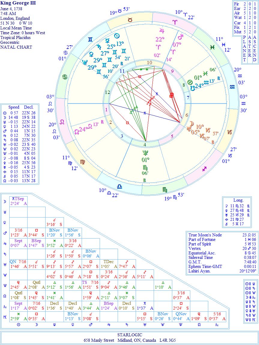 We are in the middle of watching “Queen Charlotte” on Netflix. It has reminded me that I had yet to tackle the birth chart of her husband, George III. In particular, I wanted to see if his madness had an astrological explanation.