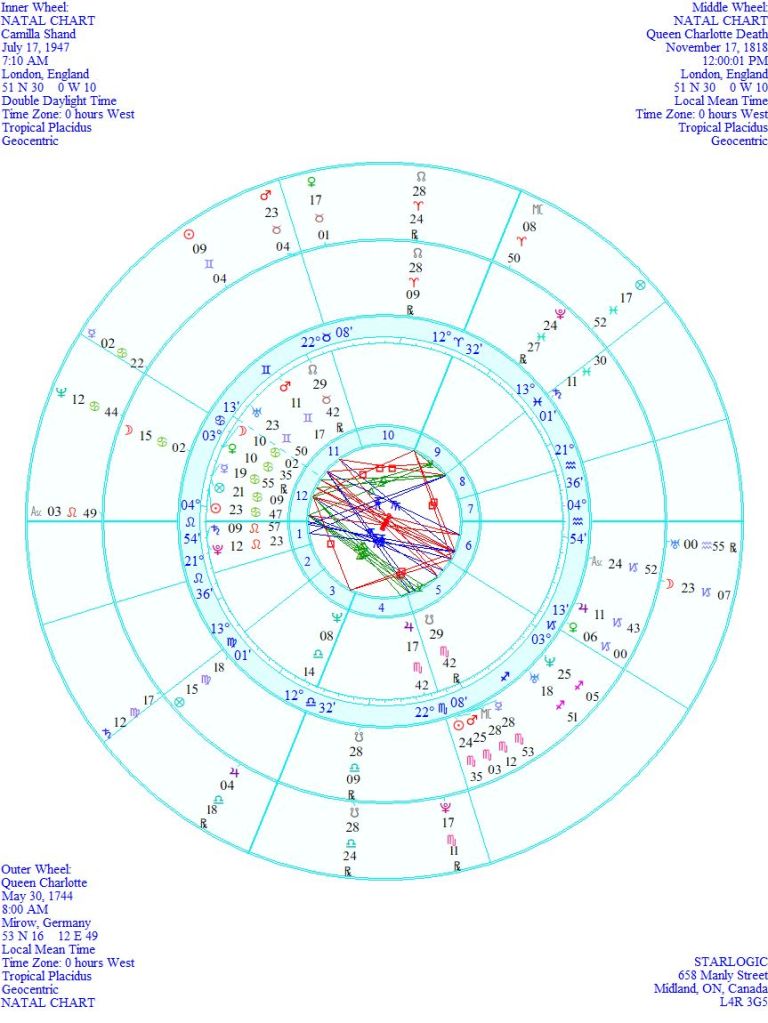Again, the Ascendants line up nicely (as they do with their spouses). But it’s Camilla’s Sun that surprises me: it is opposite Charlotte’s ‘fatal’ Ascendant (for a noon death) and Charlotte’s natal Moon. That’s got to account for all lot, right? Camilla’s South Node is conjunct Charlotte’s ‘fatal’ Mercury/Midheaven conjunction. And Charlotte’s natal Sun is conjunct Camilla’s Mars. Camilla’s Moon/Venus conjunction is conjunct Charlotte’s natal Neptune and opposite Charlotte’s ‘fatal’ Jupiter, while Camilla’s Jupiter is conjunct Charlotte’s natal Pluto. Is that enough proof?