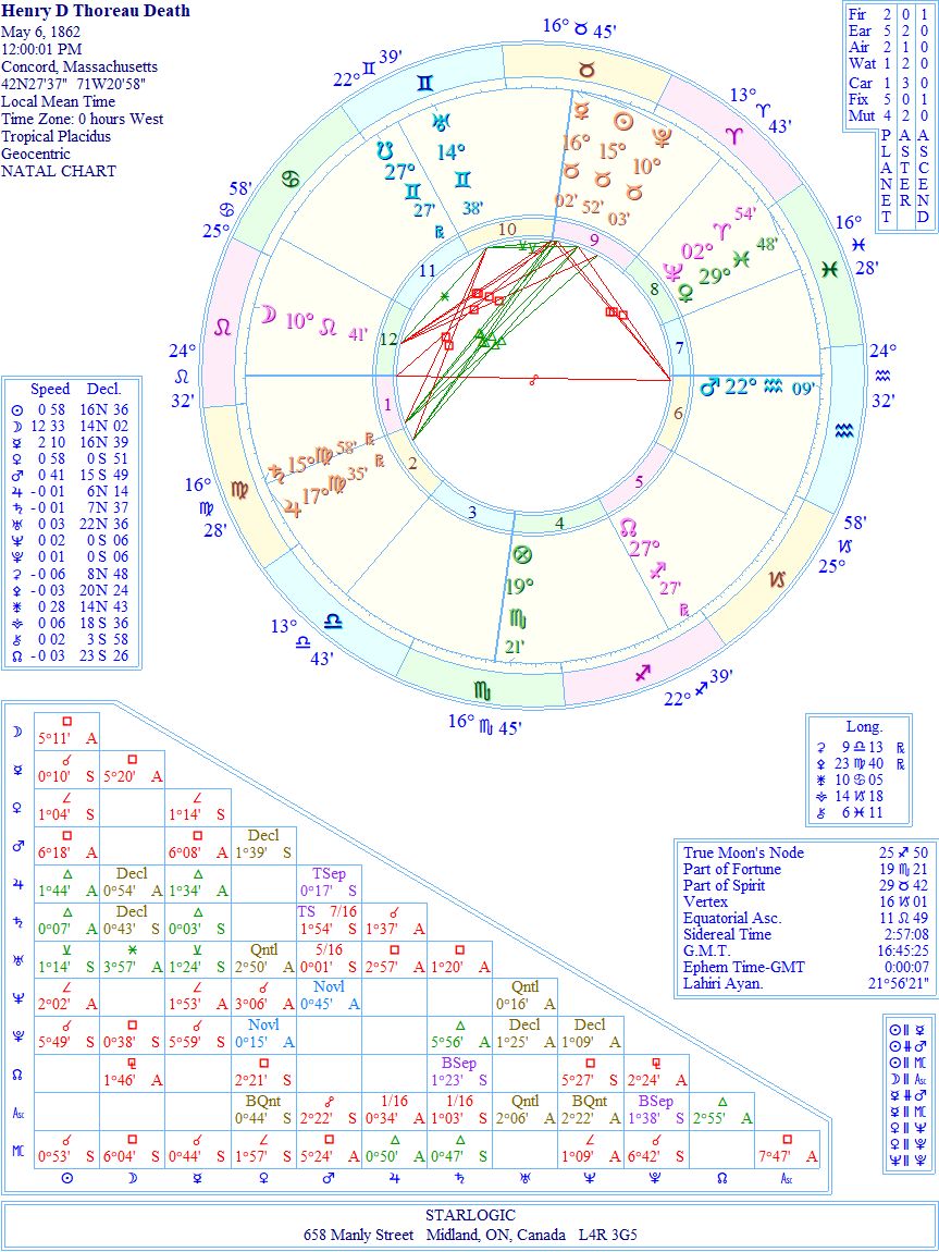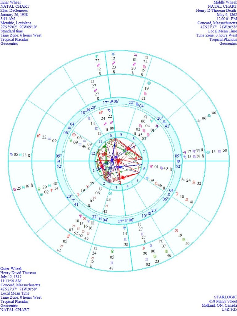 So, then I looked at Ellen’s natal South Node, and wouldn’t you know it, it is conjunct Thoreau’s ‘fatal’ Pluto and his natal Mars. Even Ellen’s Part of Fortune gets in on the act by being conjunct to Thoreau’s natal North Node. And, for good measure, Ellen’s Uranus (which is opposite her Sun/Mercury conjunction) is conjunct Thoreau’s ‘fatal’ Moon.