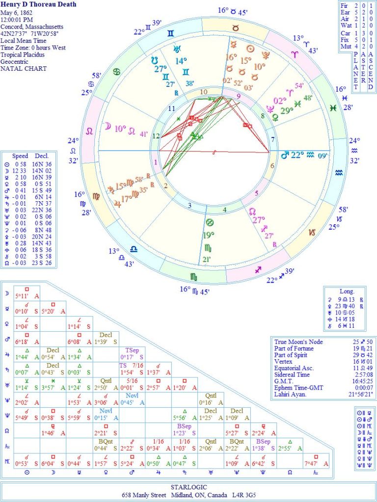 Ellen’s Mars/Saturn conjunction (in her 10th House of Career) is conjunct Thoreau’s ‘fatal’ Saturn and his natal Neptune. (Oh-ho, says I, to myself). At the other side of the divide (meaning in opposition to Ellen’s Mars/Saturn conjunction) sits Thoreau’s Moon/Mercury conjunction (and his ‘fatal’ South Node).