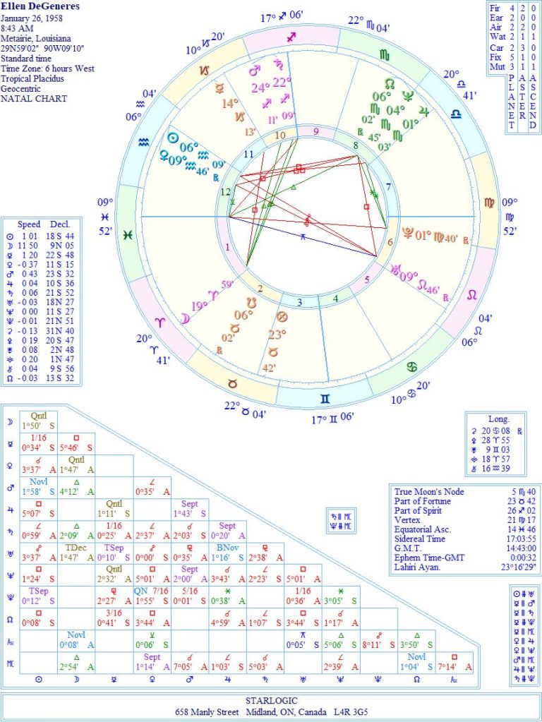 Ellen DeGeneres needs no introduction. To say she is a gender rule breaker and social icon is to underestimate her impact on modern womanhood in the United States. But, a philosopher? Not so much. Her birth chart contains but one inconjunct: