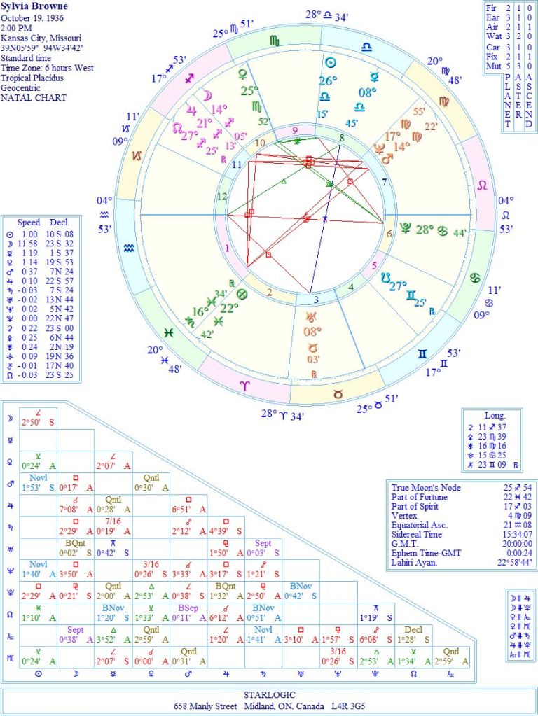 The double T-square in Sylvia’s birth chart could be the reason she has led a ‘life in two worlds’: Saturn opposition Mars/Neptune conjunct, all squared to the Moon/Jupiter conjunct. This may be a trick of the light, but I doubt it. And there is but one inconjunct.