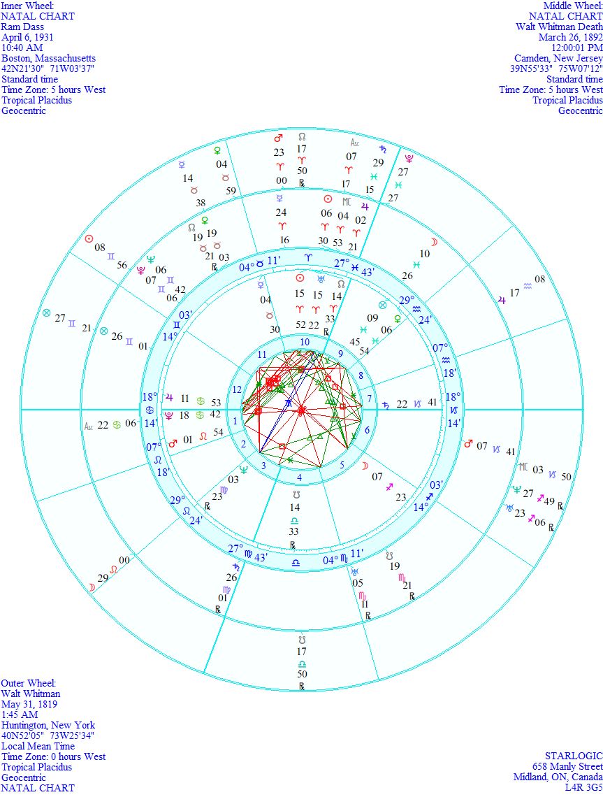 News flash: Both men have conjunct positions of their natal North Nodes, and Dass’ Mercury is conjunct Whitman’s natal Venus, while Dass’ Neptune is conjunct Whitman’s natal Moon. Hmm.