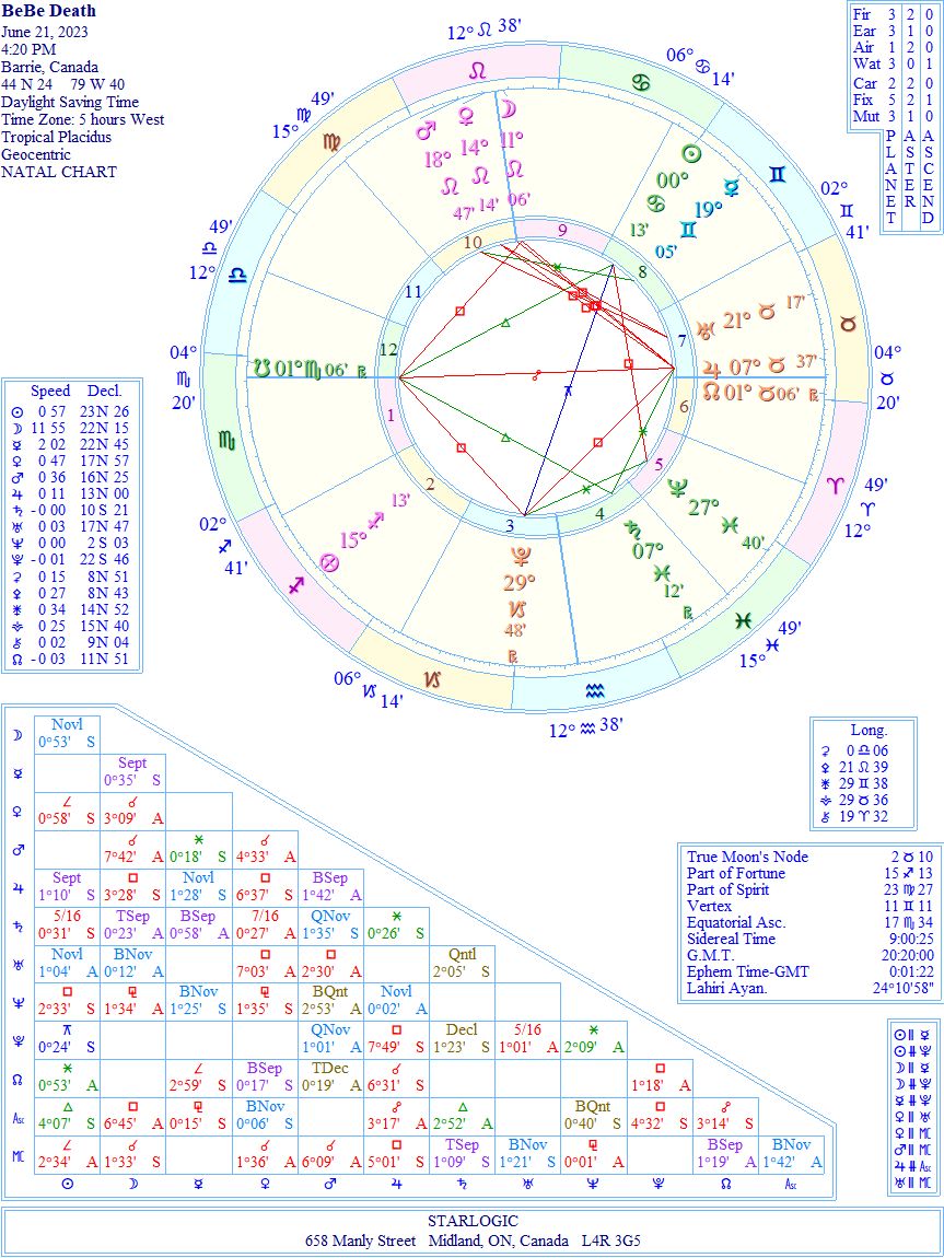 As you may have seen, previously, I did a ‘birth’ chart for BeBe, based at noon on the day she was born. You can view that chart, here. The South Node is within 3° of the Ascendant, but that was just luck of the draw. However, I drew up her ‘death’ chart for yesterday, and got a huge surprise.