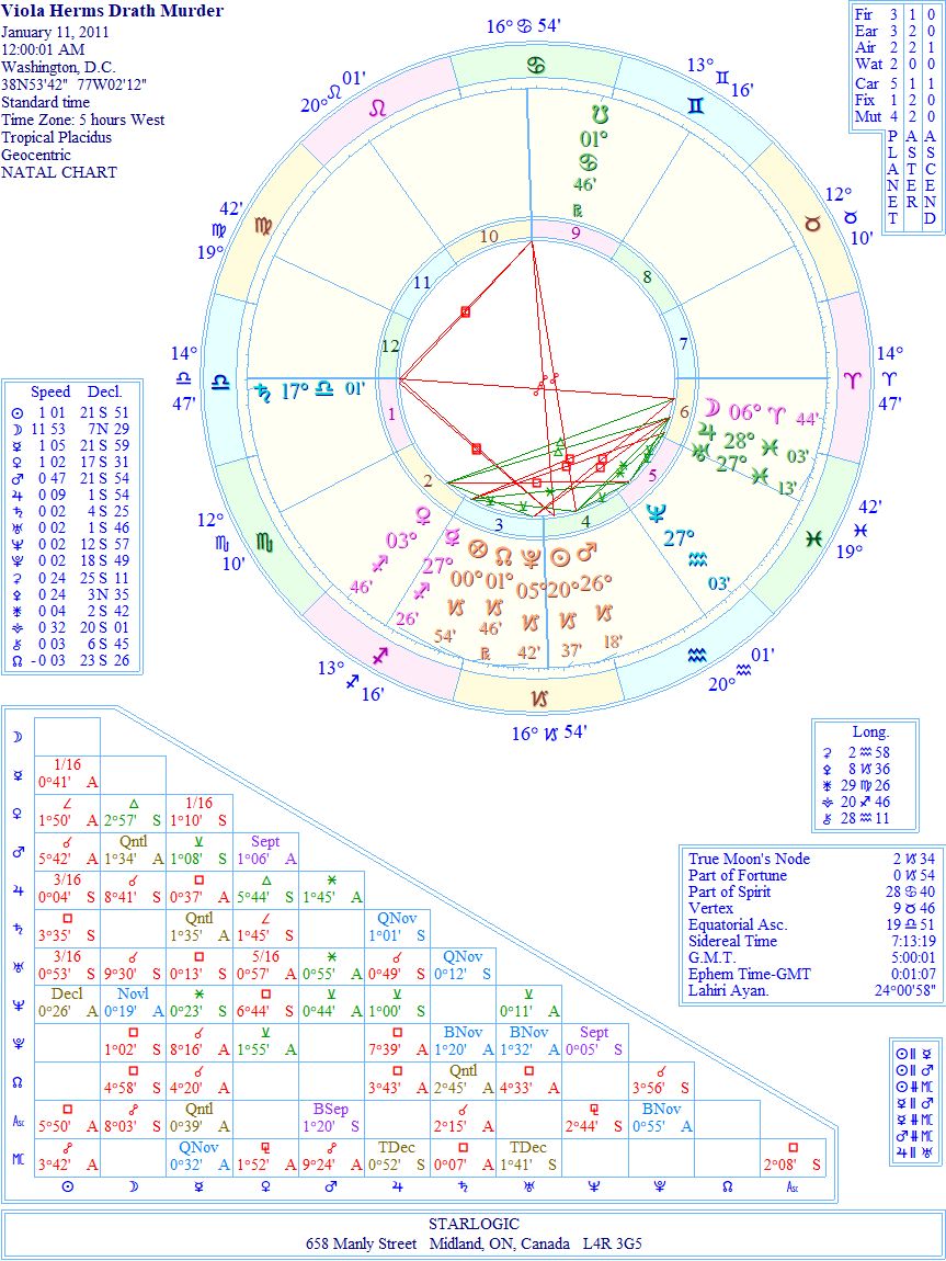 Have you ever seen a more specific ‘murder’ chart? I haven’t. Saturn conjunct the Libra Ascendant is the balancing act constraint that Muth must have felt he was under. The reason? The Moon in Aries represents his wife’s biting words. And the Sun/Mars conjunction in Capricorn is the ‘snap’. Do you see?