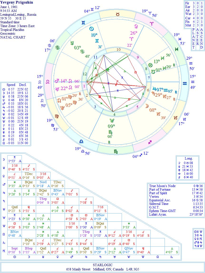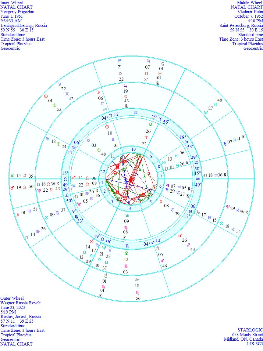 I thought so: this is Putin’s “Waterloo”. Putin’s South Node is conjunct the event’s Mars, and his Ascendant is conjunct the event’s Part of Fortune. In the background, Putin’s planets are affected by Prigozhin’s planets, too. As I said, nothing happens in a vacuum.