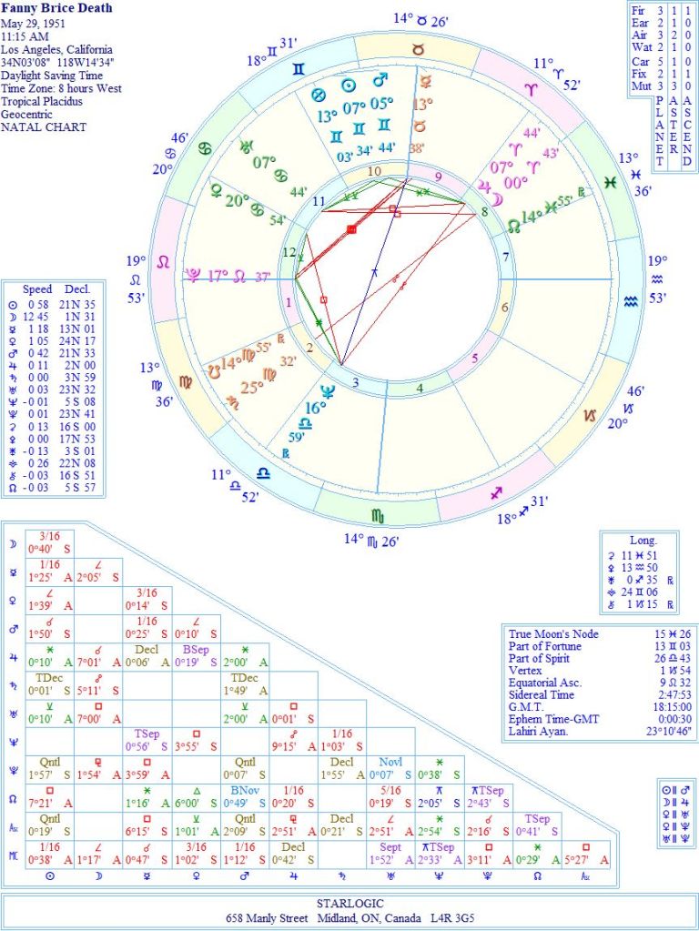 That combination of Neptune and Pluto conjunct, both inconjunct to the Sun and Mercury, may be where her humour comes from. I’m not going to delineate those aspects, since my purpose for looking at Ms. Brice’s birth and death charts is to investigate who she might have returned as when she reincarnated. Her death chart will give us a huge echo: