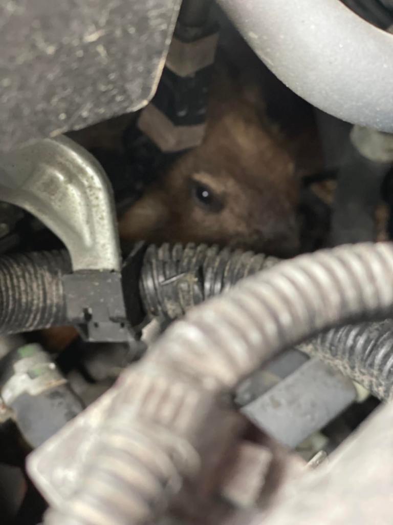 This little fellow decided to seek shelter in the engine of our car, a week-and-a-half ago. He was trying to escape the attention of two large dogs. However, his warning noises made his whereabouts quite obvious (to man and dogs), so I opened the hood of the car and there he was sprawled over the engine cover. He quickly scrambled down into the interior of the engine to elude detection. My wife, Susan, took this photograph of his hidey-hole.