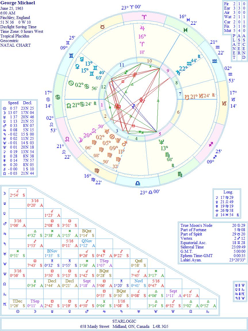 This timing is considered excellent. That Moon opposition Saturn probably explains a lot about George’s emotional issues. His father was strict and his mother was tolerant. George probably tried to please his father, but went against his wishes by teaming up with Andrew Ridgeley, a childhood friend. Years later, George’s father would be so proud of him, but the bad boy image may have stuck. There are two inconjunct, both involving Neptune.