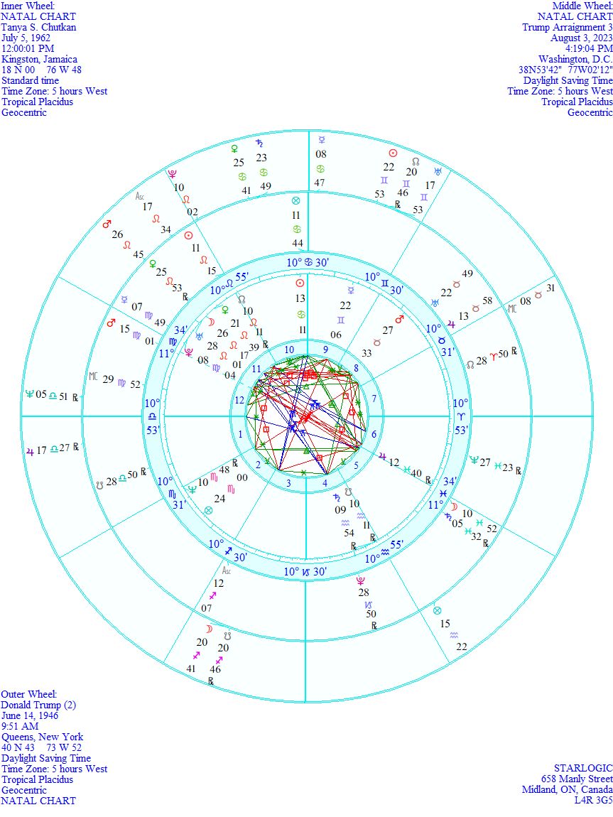 I don’t know Ms. Chutkan’s time of birth, so I set the clock to 12 noon, local Jamaican time. There are three inconjuncts, two of which are dependent on this being the correct time, so only one is definite. Two form a Yod, pointing at Saturn (conjunct South Node) in Aquarius. But I shouldn’t hold my breath.
