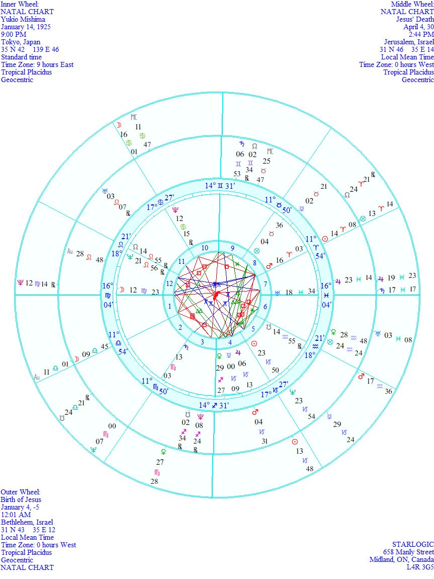 This timing is considered good because it’s based on a biography of Yukio Mishima. I suspect the real time was 15 minutes earlier, as then the Moon would have been exactly conjunct the Virgo Ascendant, and the Mars (death by sword) would have matched his age (45) when he killed himself.