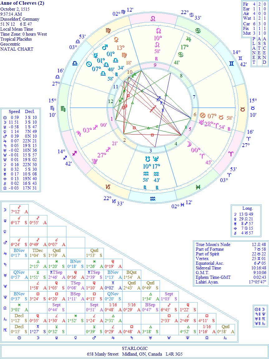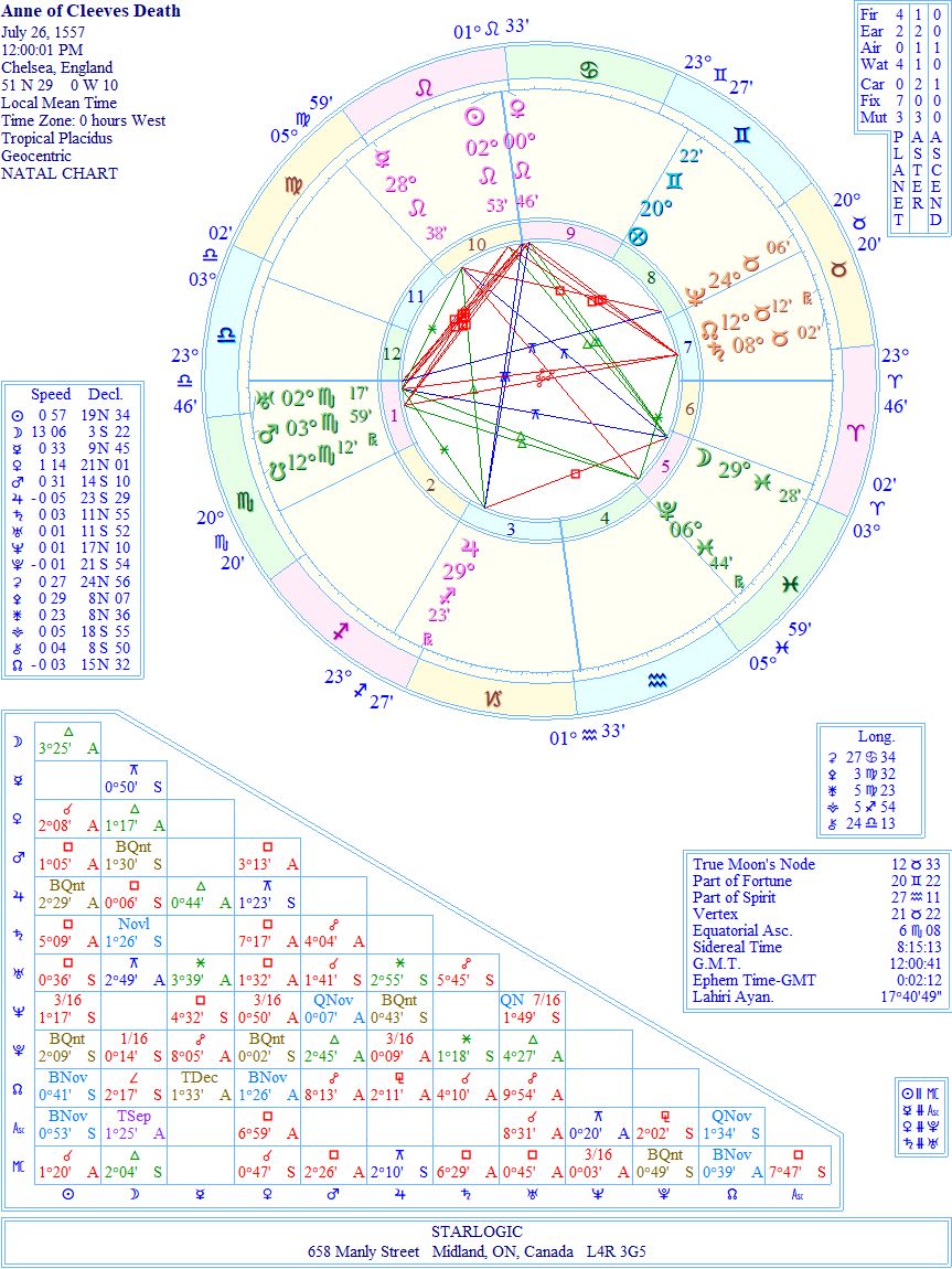 You may have noticed that Anne’s birthdate is either June 28th or September 22, 1515. I have chosen the second date, so already we are in speculative territory. I have also randomized the timing of her birth. I won’t delineate the aspects because we’re not on solid ground, as it were. Her date of death, however, is known: July 16, 1557.