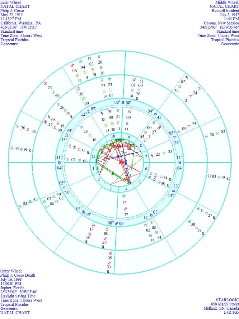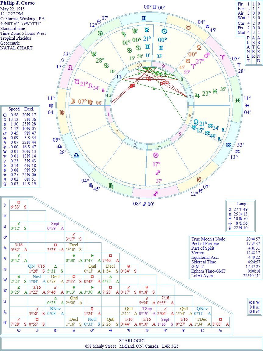 Corso’s birth chart is randomized. I like how none of the planets are inconjunct to each other. That means that he had no hidden agenda, at least as far as I can ascertain. What you see is what you get.