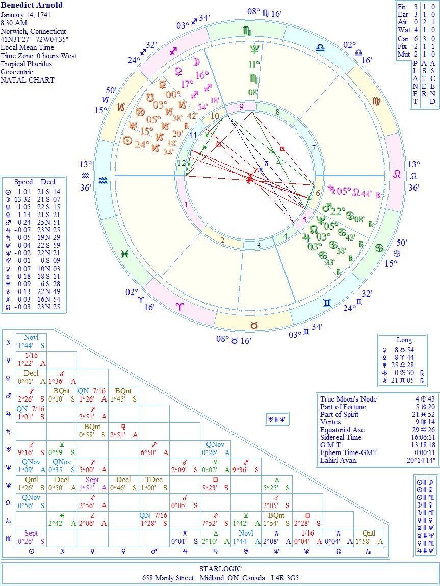 I rectified Arnold’s birth time, based on his father’s death (Saturn) when he was 20, and joining the Militia (Mars) @ age 16. The conjunction of the Moon and Venus in Sagittarius in his 10th House (of Career) kind of implies what the quote said about him (in the title of this post). There are two inconjuncts, one each from the conjunction of Jupiter and Neptune: they might also explain why he reverted to the other side in the American Revolutionary War. Since these two both connect to the Midheaven, I cannot rely upon their correctness because of his unknown birth time, so I won’t delineate their aspects. However, I will repeat this quote from Wikipedia: