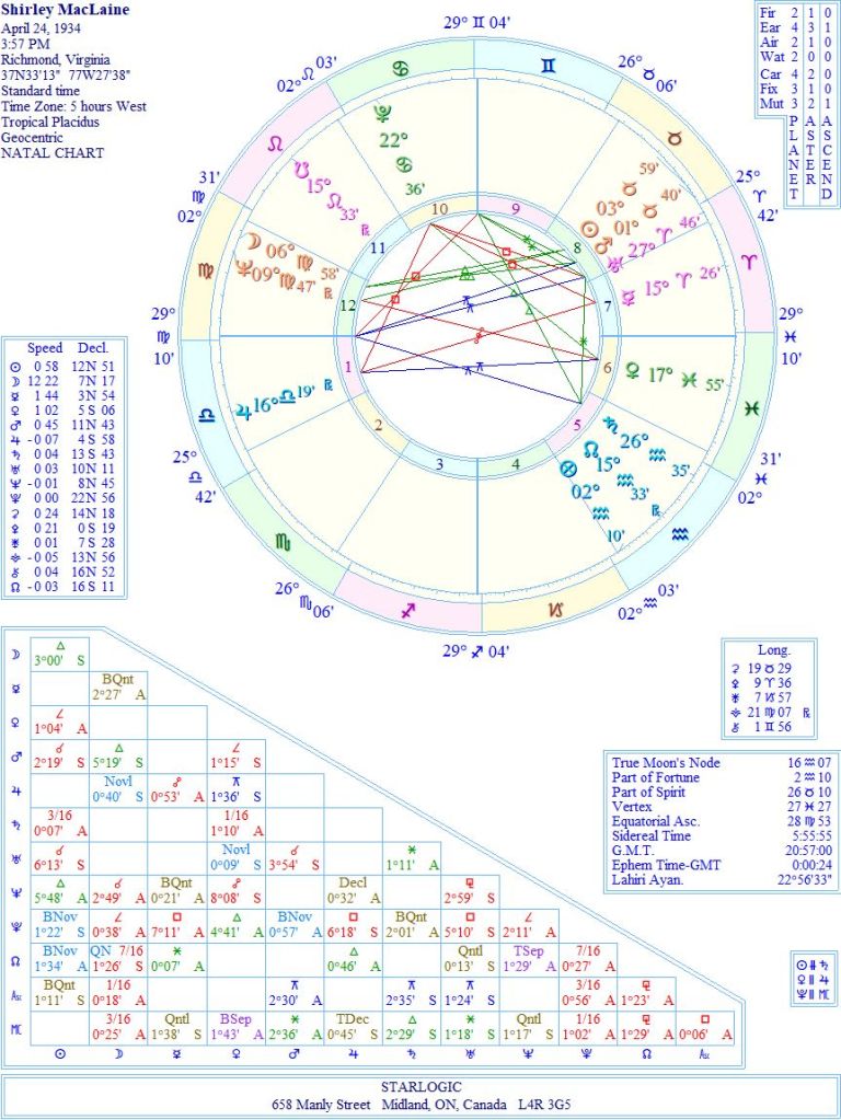 As a lifelong follower of Ms. MacLaine, I can confirm that some of those ‘concerning’ cards are probably true, especially if she’s anxious to move forward into her next stage of life. So, I’m finally looking at her birth chart today.