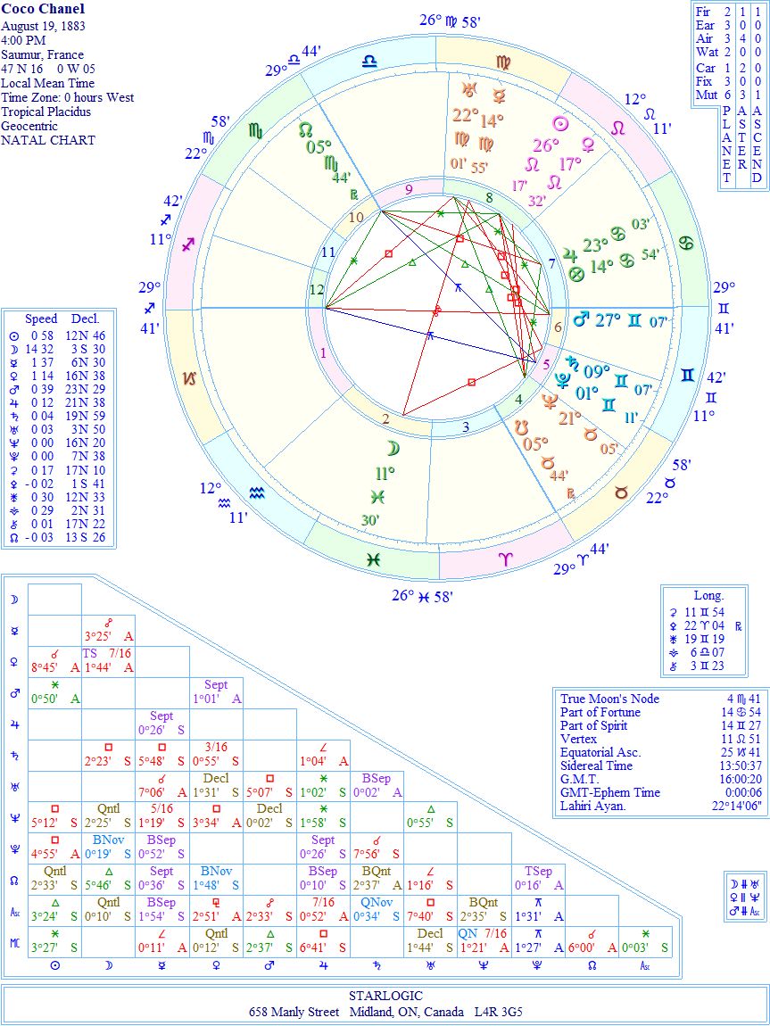 This chart was already on my astrology program. Other web sites have the same time, citing her Birth Certificate. There is a Yod pointing at Pluto, formed from inconjuncts to the Ascendant and Midheaven. Hmm. If the time were any earlier or later, that Yod would disappear in a puff of smoke.