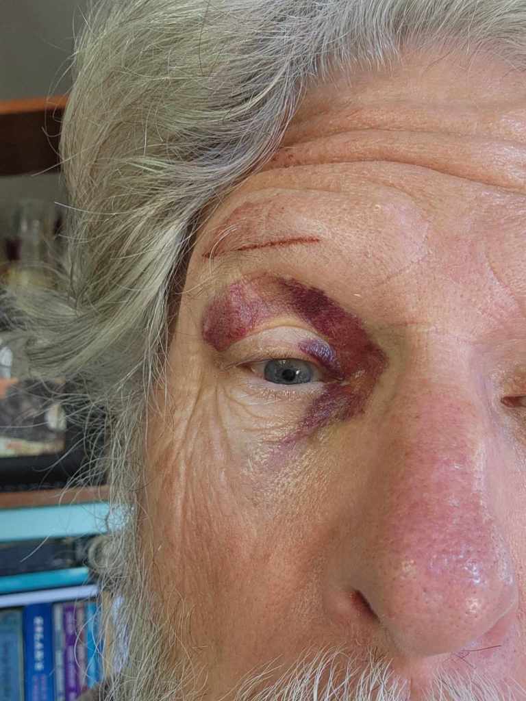 This selfie, that I took yesterday morning, shows how black my eyelid has become. It isn’t sore, but it looks horrible, at least to me. (And, yes, I am a little bit vain, if I’m being honest with you.)