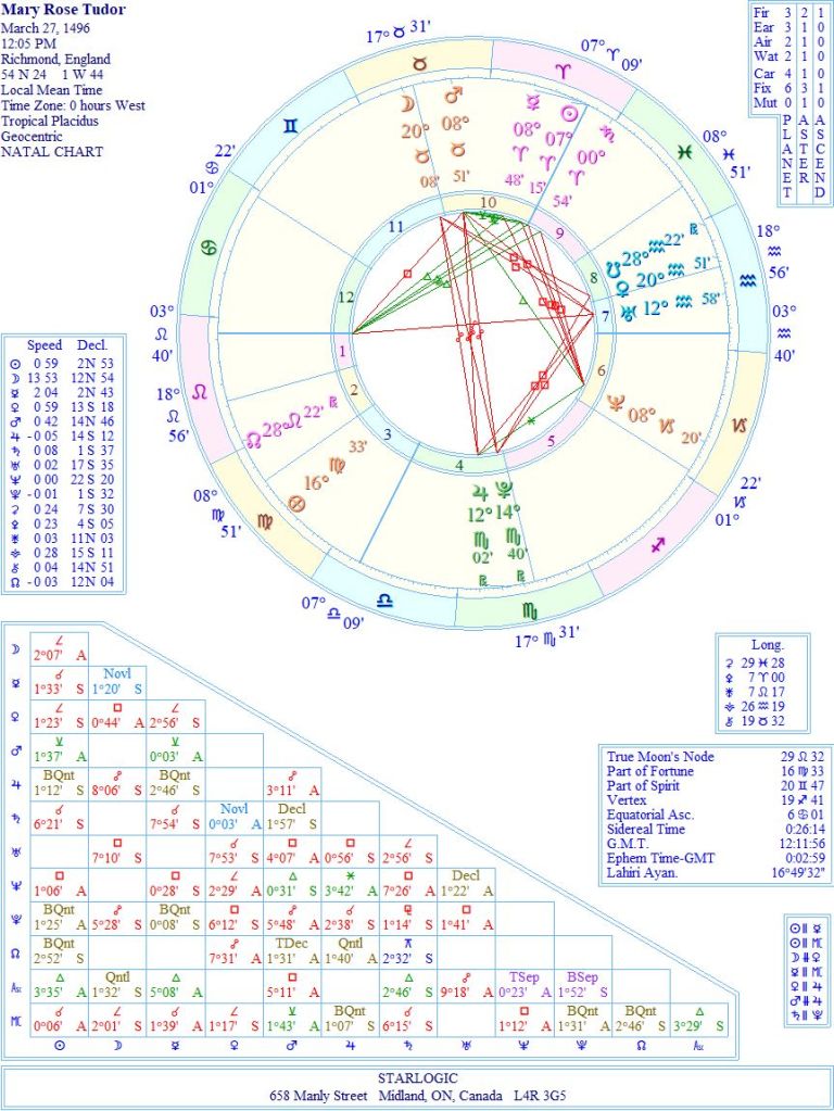 Does this look like the chart of a Queen of France (if only for three months)? There are no inconjuncts, so no hidden agenda. The two interesting things about her life is that her own mother was Elizabeth of York and she was the maternal grandmother of Lady Jane Grey. (My daughter Rosanna will see the irony of these connections.)