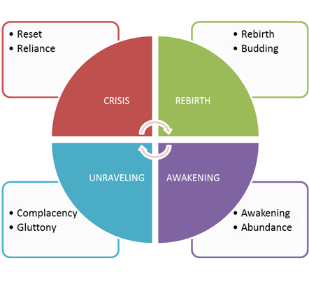 According to a book from 1991, the world (and mostly, America) goes through a cycle of four turns.