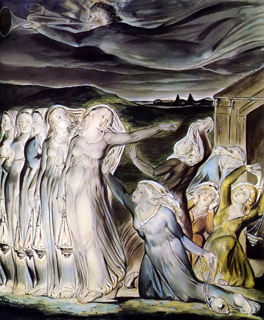 There is something about this Pamela Colman Smith painting from 1903 that puts me in mind of William Blake’s work like this one, featuring the Wise and Foolish Virgins (1826):