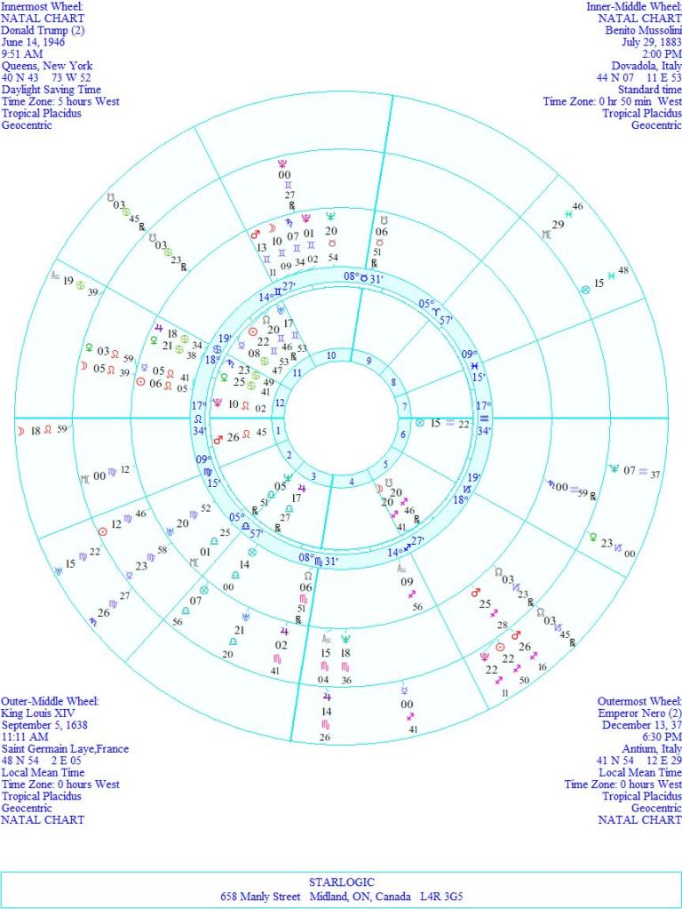 What initially strikes me is the fact that each subsequent life seems to highlight some aspects and planetary positions of the previous one. There is a good chance that the 1600 years between Nero and Louis XIV held some other incarnations which may have been in times of absolute rulership. One day, they may come to light. In the meantime:
