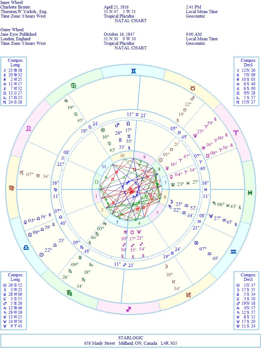 The full spectrum of aspects between these two charts is a wonder to behold. No doubt the publication of this book was cosmically connected (Charlotte’s Moon conjunct Eyre’s Neptune; Charlotte’s Mercury conjunct Eyre’s Uranus; Eyre’s Moon and Mercury forming a Yod, pointing at Charlotte’s Midheaven; and Charlotte’s Saturn and Neptune, forming a Yod, pointing at Eyre’s Jupiter).