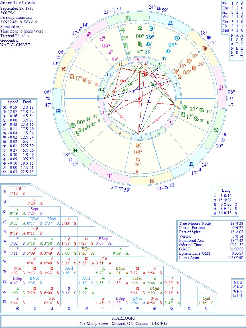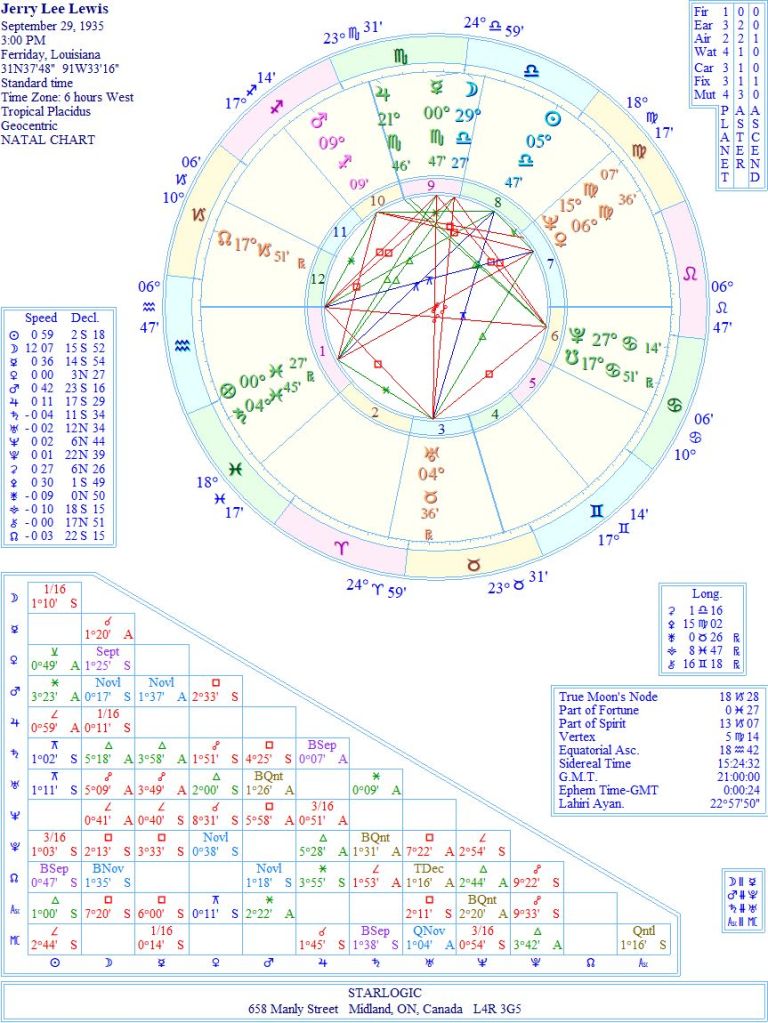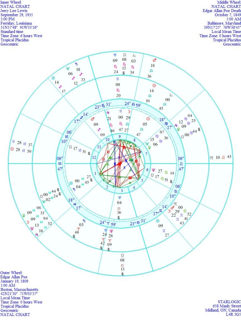 Jerry Lee Lewis‘ birth chart has a plethora of interesting aspects. Supposedly, this is an accurate birth time, since all astrology sites have the same time, including my Kepler 7.0 computer program. The one aspect that caught my eye was the inconjunct linking Venus and his Ascendant @ 6° Aquarius 47’. That degree implies a past life around 1860. So, just to be clear, this is about 5° out from Poe’s death. I guess the Universe wanted to highlight the Venus link, which would have been lost if his birth time was 20 minutes earlier. Strange that.