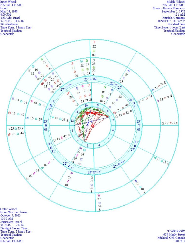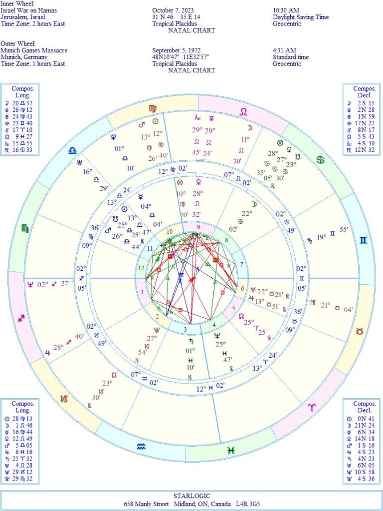 Note, especially, how the War’s Moon in Cancer is conjunct the Munich South Node/Venus conjunction. And War’s Pluto is conjunct Munich’s North Node. War’s Ascendant is conjunct Munich’s Neptune. War’s Venus is conjunct Munich’s Mercury/Ascendant conjunction. War’s Mercury is conjunct Munich’s Pluto. And, finally, War’s Sun is conjunct Munich’s Uranus, while War’s Uranus is conjunct Munich’s Midheaven. There really are too many links between these events to be considered a coincidence.