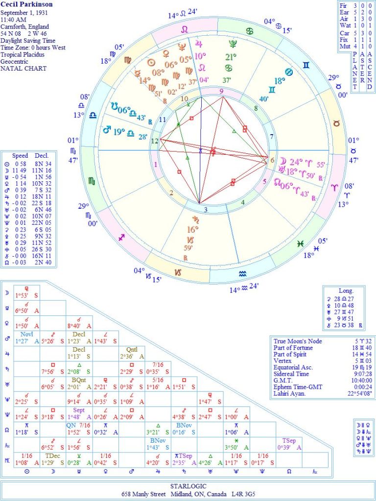 This timing is randomized. Therefore, the single inconjunct linking Saturn and the Midheaven is fleeting, and probably nonexistent, too. But it does tell a tale, nonetheless. Having lived in England for part of this time, I can attest to the fact that Cecil Parkinson was a man of great political significance.