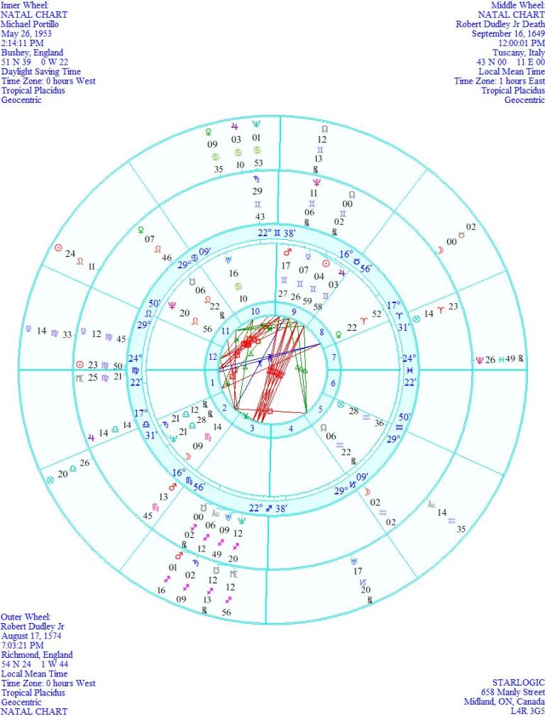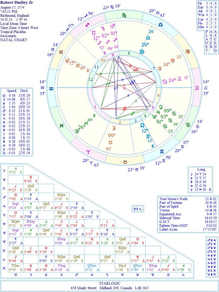 This may be the last Luke Aaron lead that I’m going to (try to) follow. Officially, I believe, he intended that I compare Robert Dudley (Sr) who was rumoured to have been romantically involved with the young Princess Elizabeth. Interestingly enough, my Kepler 7.0 program has a chart for Robert (Sr) but the date is at variance with the birth date (by as much as 2 years and 3 months) as written on the Wikipedia page for him, so I think the Universe had decided to shift my attention to Robert (Jr).