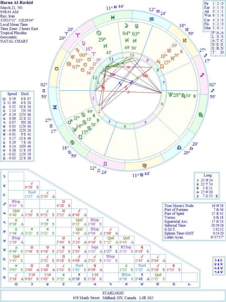 This is as close to a correct date as is possible from this great distance of time and space. Harun al-Rashid might be a shadowy figure from the 1001 Arabian Nights, but he was a real flesh and blood person. The timing of his birth chart is randomized, so everything about it might be wrong, and yet there are four inconjuncts, two linked from Pluto to his Saturn and Uranus conjunction and two linked from the Midheaven to his Mars and Neptune conjunction. They are very powerful aspects, if true.