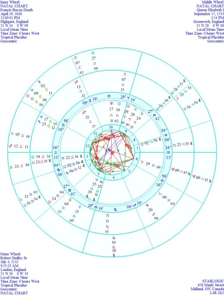 Is it proof? Perhaps. Bacon’s ‘fatal’ Moon is conjunct Elizabeth’s Pluto and Dudley’s Pluto (which isn’t too surprising since Pluto moves so slowly). Bacon’s ‘fatal’ Uranus is conjunct Elizabeth’s North Node and Dudley’s Venus. But is it enough?