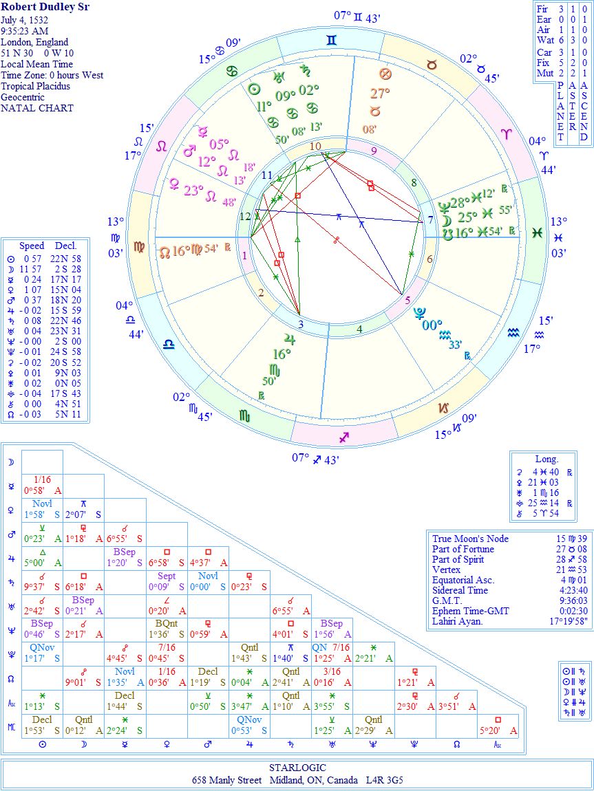 Earlier today, I experimented with a combination of charts to see if paternity could be proven using astrology. But the chart I used for Robert Dudley was patently incorrect (using Elizabeth’s birth date and one year later). So, I’m going to redo this experiment with a new version of his birth chart.