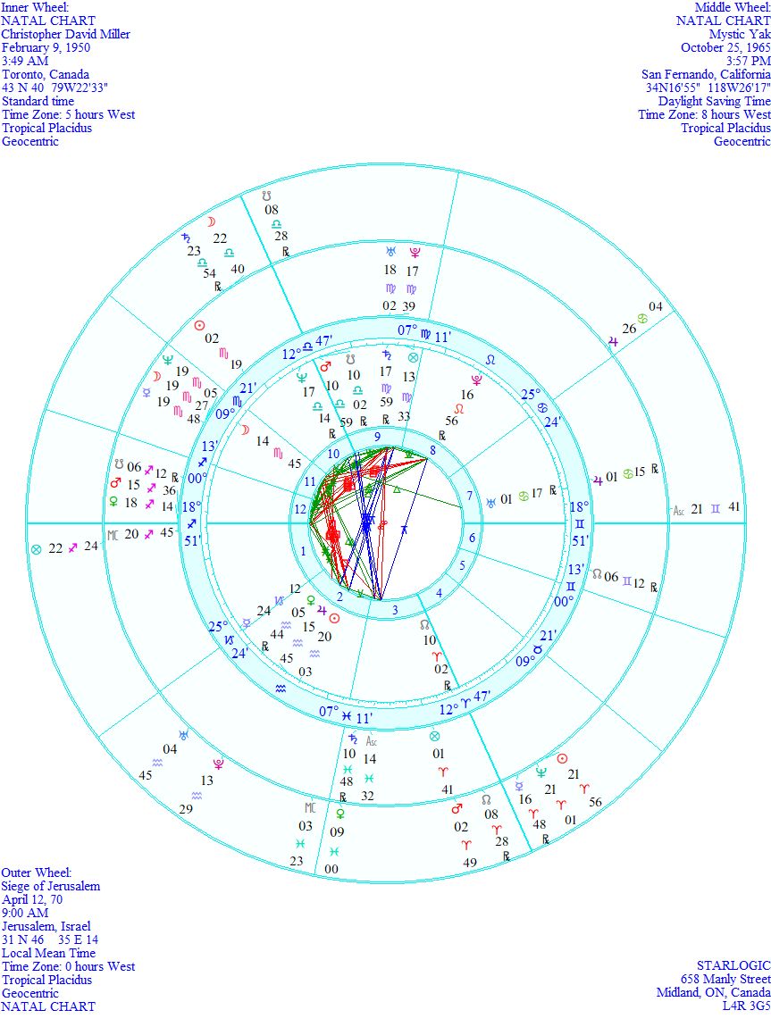 Now, this might seem a bit of a stretch, but a line-up in his chart (Sun through Mercury in Scorpio) has an echo in history (Mars through Sun in Aries). At first glance, they don’t seem to totally agree, and yet when you put his birth chart up against the Siege of Jerusalem in 70 AD, a weird triple Yod appears, which then extends into a double Yod with Uranus and Pluto. This cannot be coincidental.