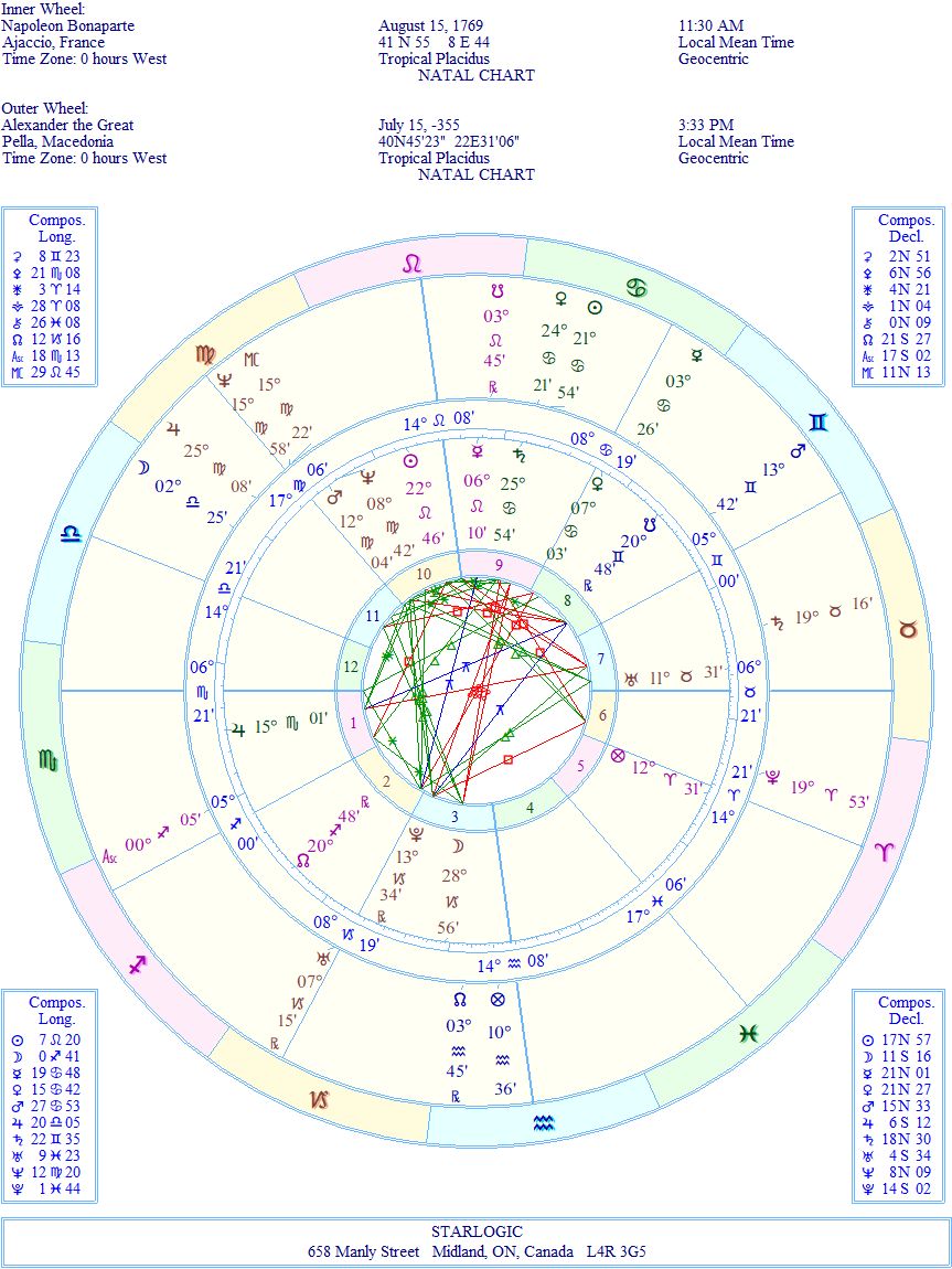 For some reason, the image of Napoleon sitting on his horse in front of the Sphinx reminded me that Napoleon was seeking to conquer the world, just like Alexander the Great. (And I may have heard a snippet of dialog that suggested the same thing.) That got me to thinking about comparing their birth charts: