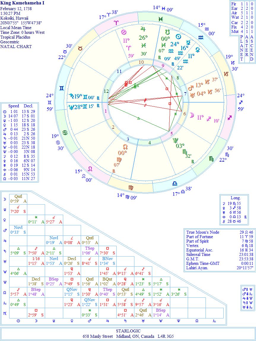 This day, the month and the year may all be wrong, but it’s the best I could do, including randomizing his birth chart. King Kamehameha I was the one who united the islands into one nation. The fact that Saturn and Neptune bracket the resulting Gemini Ascendant has to represent ‘something’, doesn’t it? I also raised a death chart, but I’ll show you that in comparison to Elvis birth chart.’
