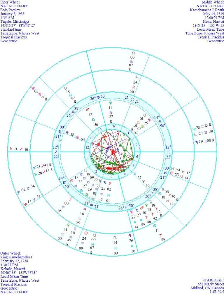 This is not the strongest indication of a karmic relationship between these two individuals in time, but Kamehameha’s natal Moon is accidentally conjunct Elvis’ Ascendant. At the same time, Elvis’ natal Moon is (also accidentally) conjunct the King’s natal South Node. And Elvis’ Mars is opposite the King’s ‘fatal’ Mars, and opposite the King’s natal Part of Fortune. But is it enough? Perhaps.