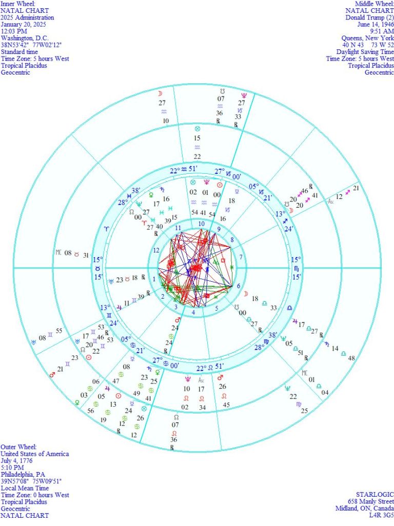 My initial reaction to the aspects between these three charts is that he will not succeed, but it won’t be for lack of trying. The Admin’s Mars is conjunct Trump’s Venus/Saturn conjunction, which is also conjunct USA’s Mercury/Part of Fortune conjunction. And the Admin’s Moon (popular vote) is conjunct Trump’s Jupiter (justice) and USA’s Saturn (control). That seems to me to hint at his being finally brought to justice (even if it’s only ‘poetic’), hence the quoted first line from John Denver’s “Leaving on a Jet Plane” at the title of this piece, which came to me during my afternoon nap a few minutes ago.