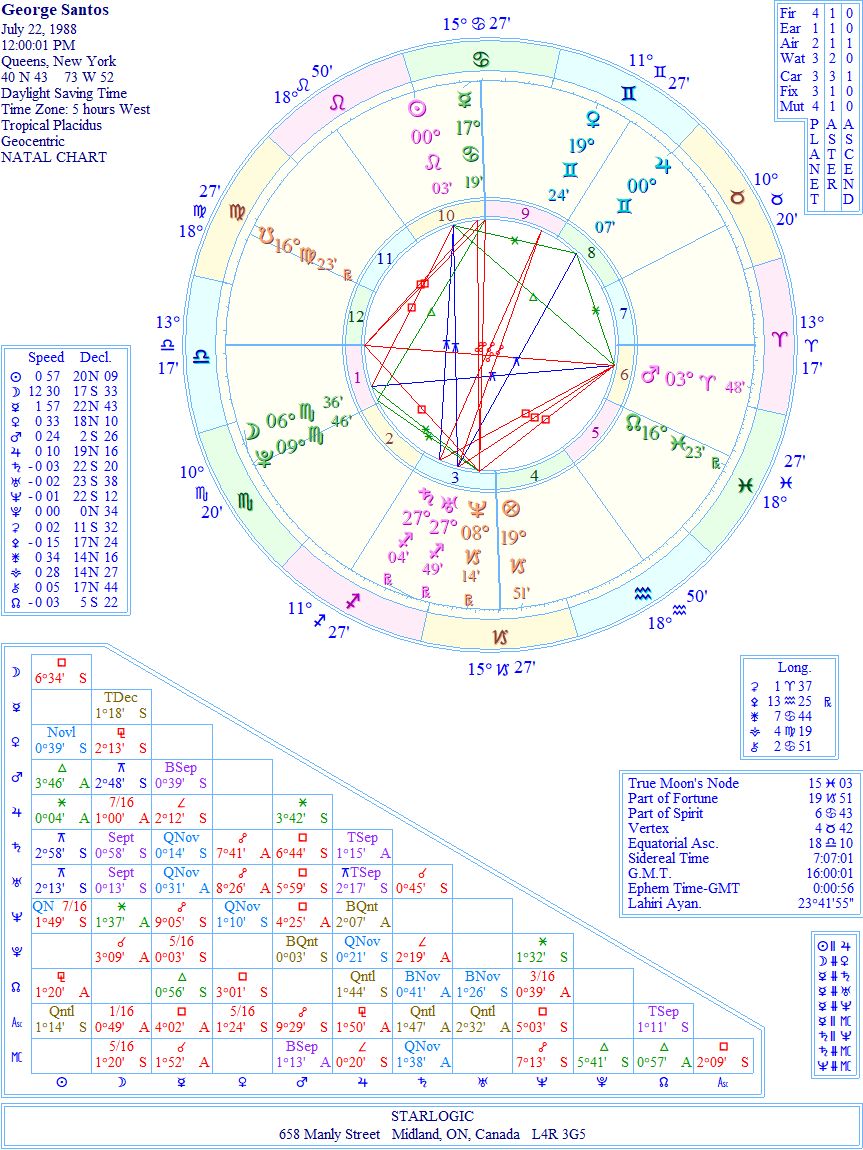 Now that George Santos is about to be ‘booted’ from the US Congress, I thought it would be informative to see astrologically what makes him tick. You mustn’t be surprised if there are ‘trickster’ energies here.
