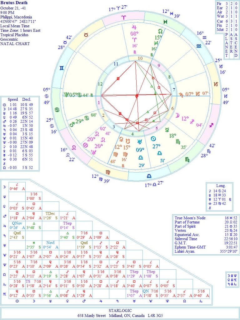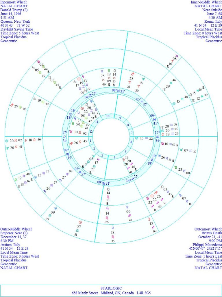 I particularly like the idea that Brutus’ fatal North Node is almost precisely conjunct Nero’s natal Part of Fortune. In fact, the Brutus and (ex-)POTUS links only make real sense when viewed through the lens of Nero’s birth and death. Does this hint at the idea that the Don will top himself, to avoid prison time?