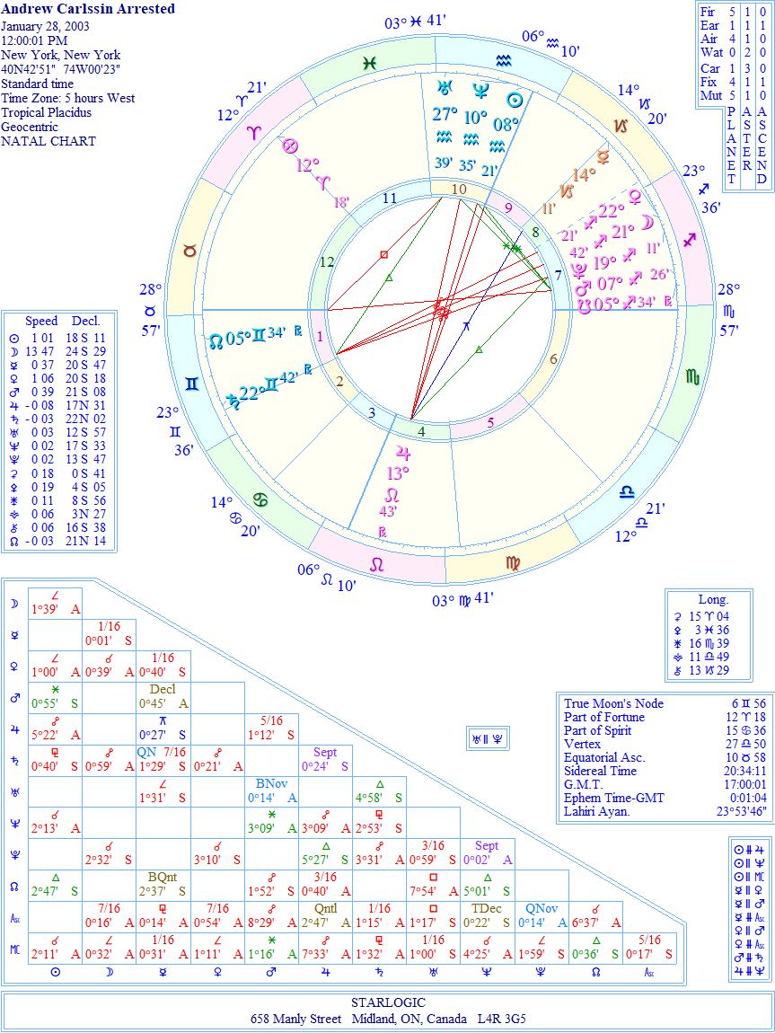 The arrest date of January 28, 2003 gave me the only real astrological hook for me to investigate.