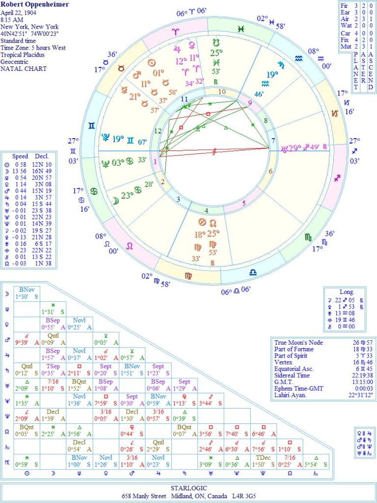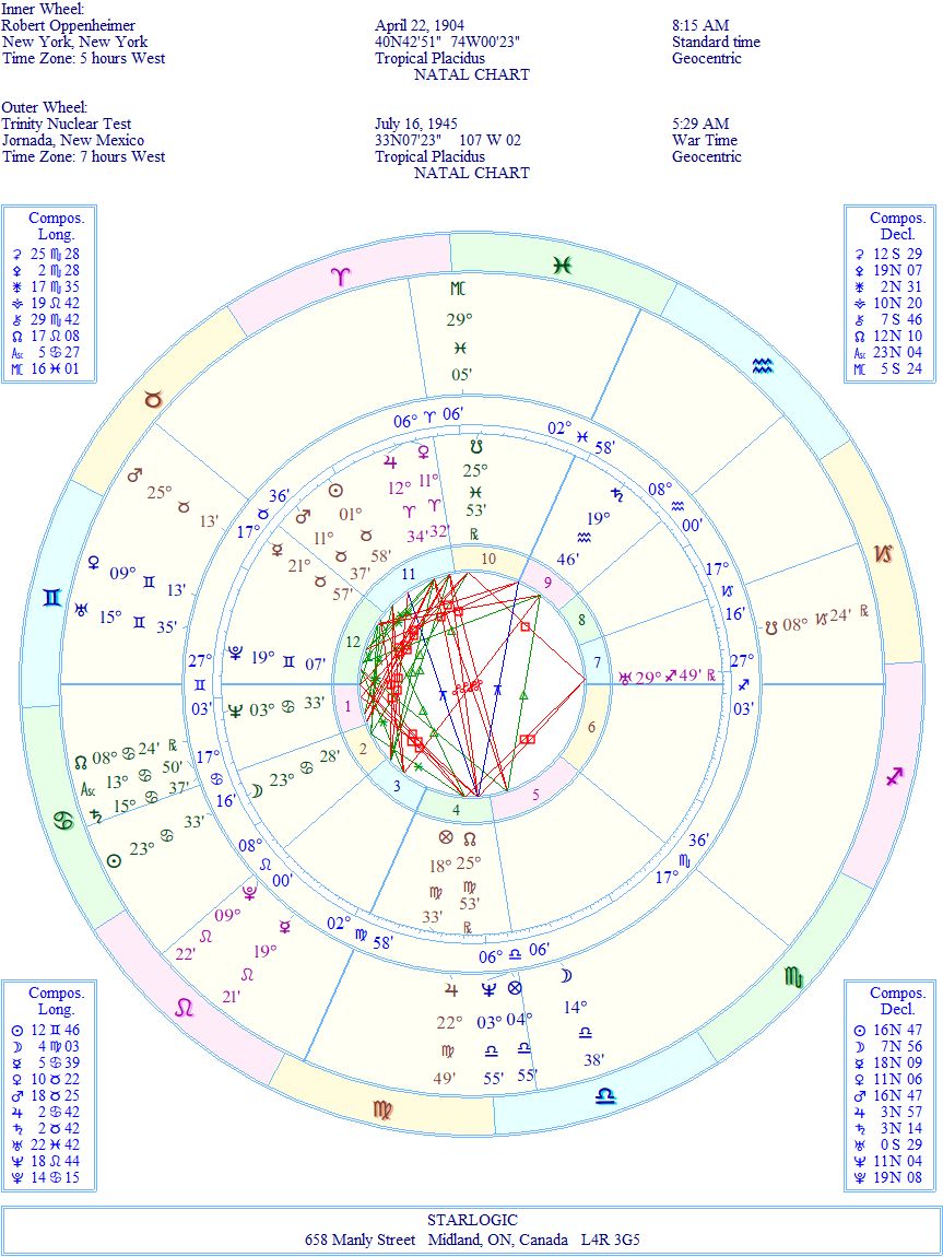 Now, compare his birth chart with the “Trinity” chart: immediately, it is very evident that he was born to produce the first atomic bomb. I especially appreciate that Oppenheimer’s Moon is exactly conjunct the event Sun. And the interactive Yod pointing at the event Neptune, formed by inconjuncts to his Sun and Midheaven, tells the tale over time. There were doubts sown about Oppenheimer’s past which suggested that he leaked the nuclear information to the Soviets. That mystery will never be solved, but it influenced a whole generation after World War II to consider him to be some kind of traitor. Men in power with vendettas pull strings behind the scenes to discredit innocent men. That’s operating here.